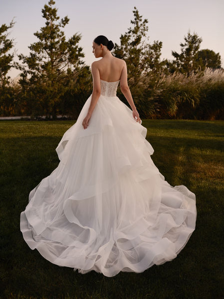 A gown of majestic beauty and ethereal grace, Diana captivates with its luxurious details. The intricately beaded corset, adorned with pearls and shimmering embroidery, accentuates the shoulders, exuding refined elegance. The voluminous tiered tulle skirt creates a breathtaking silhouette, flowing with a weightless allure. Diana is a gown for a bride who seeks a perfect balance between grandeur and delicacy—an embodiment of sophistication, radiance, and divine femininity