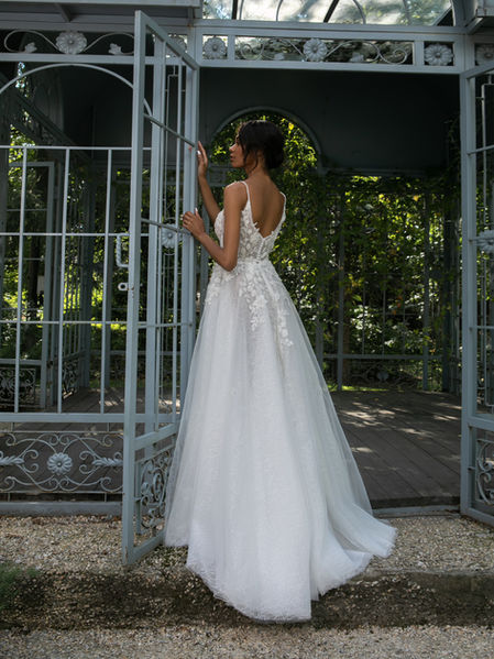 The timeless combination of a V-shaped corset and an A-line skirt perfectly intertwined in this gentle and flawless look. An ivory tulle dress with a V-shaped corset and a slit on the left leg. The delicate corset is adorned with embroidered floral lace, which transitions onto the skirt. The glittering skirt features an elegant pattern. Thin straps are embellished with beads and crystals. The corset fastens with buttons, while the skirt has a zipper