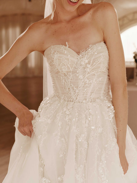 An incredibly delicate look of a true princess. The voluminous, shimmering dress made of airy tulle, adorned with intricate lace, enchants with its fairytale beauty. The sweetheart corset with horizontal draping delicately highlights the grace of the silhouette. The removable shawl adds versatility and even more elegance to the ensemble